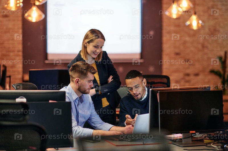 Стратегическая бизнес-встреча: группа профессионалов, работающих в офисе с использованием компьютеров