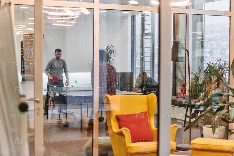 Коллеги по бизнесу отдыхают от работы, чтобы поиграть в настольный теннис, способствуя командной работе и товариществу на рабочем месте