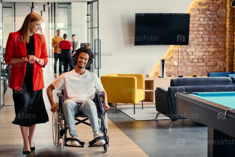 Разнообразная группа молодых специалистов, включая деловых женщин и афроамериканского предпринимателя в инвалидной коляске, совместно обсуждают различные бизнес-проекты в обстановке современного офиса стартапа