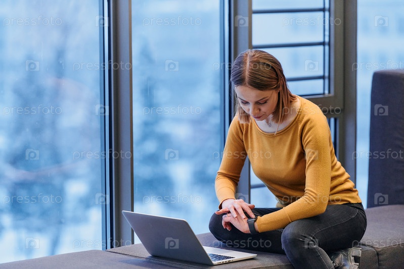 Деловая женщина пользуется ноутбуком, сидя у окна большого корпоративного здания, на фоне которого открывается живописный вид на городской пейзаж