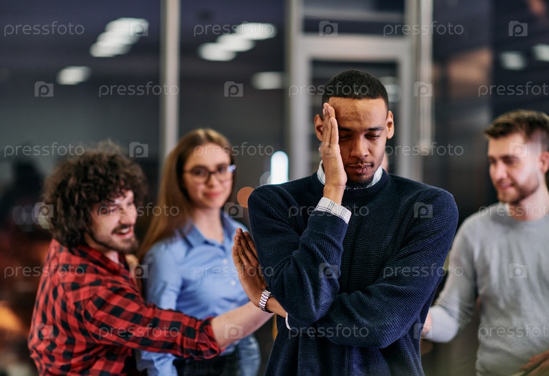 Группа молодых бизнесменов развлекается, играя в интересные игры, отдыхая от работы в современном офисе. Избирательный фокус