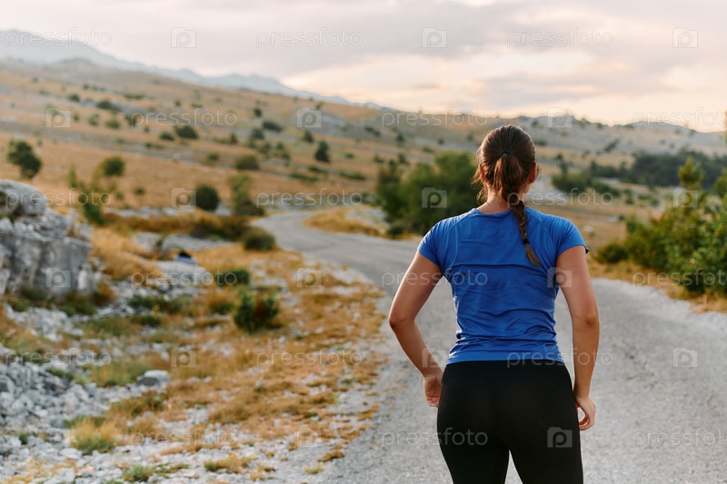 Решительная спортсменка делает растяжку после интенсивной пробежки по пересеченной горной местности
