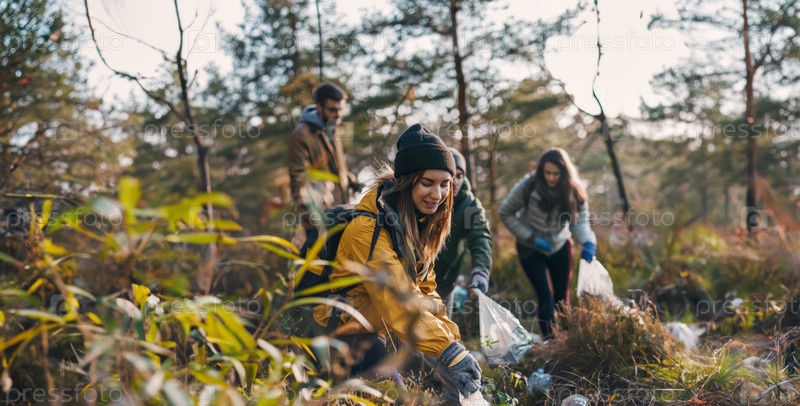Группа людей, работающих вместе, чтобы очистить лес от мусора и загрязнений.Сгенерированное изображение