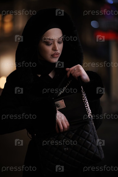 Мусульманка идет по городской улице холодной зимней ночью в хиджабе