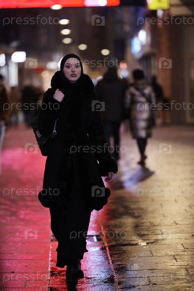Мусульманка идет по городской улице холодной зимней ночью в хиджабе