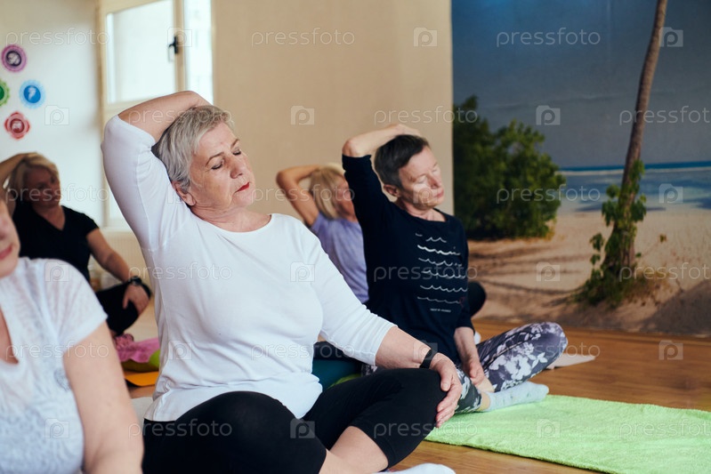 Группа пожилых женщин занимается различными упражнениями йоги, включая растяжку шеи, спины и ног, под руководством тренера в залитом солнцем месте, способствуя благополучию и гармонии