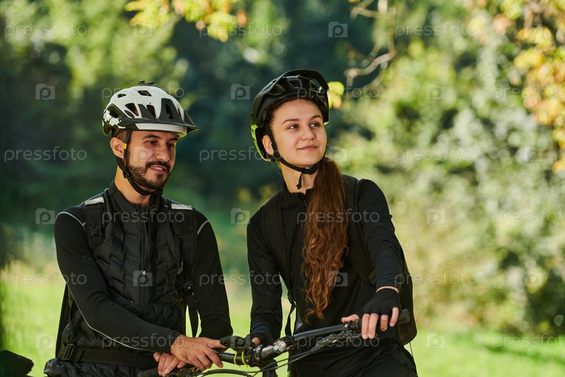 Счастливая пара, одетая в профессиональную велосипедную экипировку, наслаждается романтической велопрогулкой по парку, окруженному современными природными достопримечательностями, излучая любовь и счастье