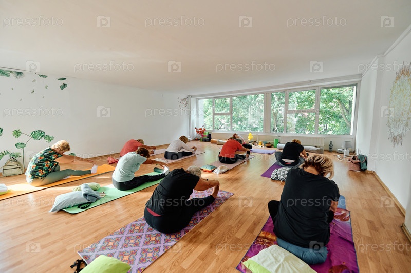 Группа пожилых женщин занимается различными упражнениями йоги, включая растяжку шеи, спины и ног, под руководством тренера в залитом солнцем месте, способствуя благополучию и гармонии