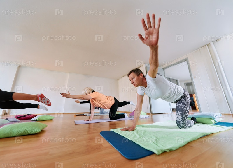 Женщины старшего возраста занимаются оздоровлением: йогой и растяжкой в залитом солнцем пространстве