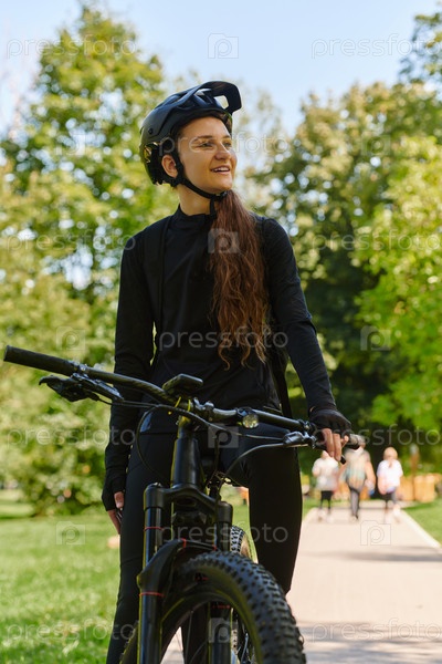 В лучезарных объятиях солнечного дня радостная девушка, облаченная в профессиональную велосипедную экипировку, находит чистое блаженство и жизненную силу, катаясь по парку на своем велосипеде, а ее заразительный смех отражает беззаботную гармонию момента