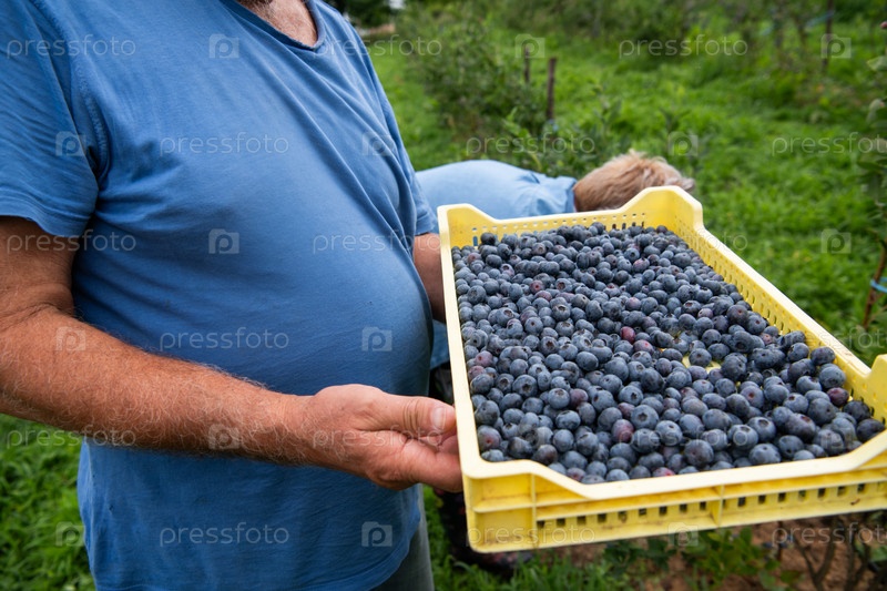 Пожилой фермер несет корзину свежесобранной черники со своей фермы