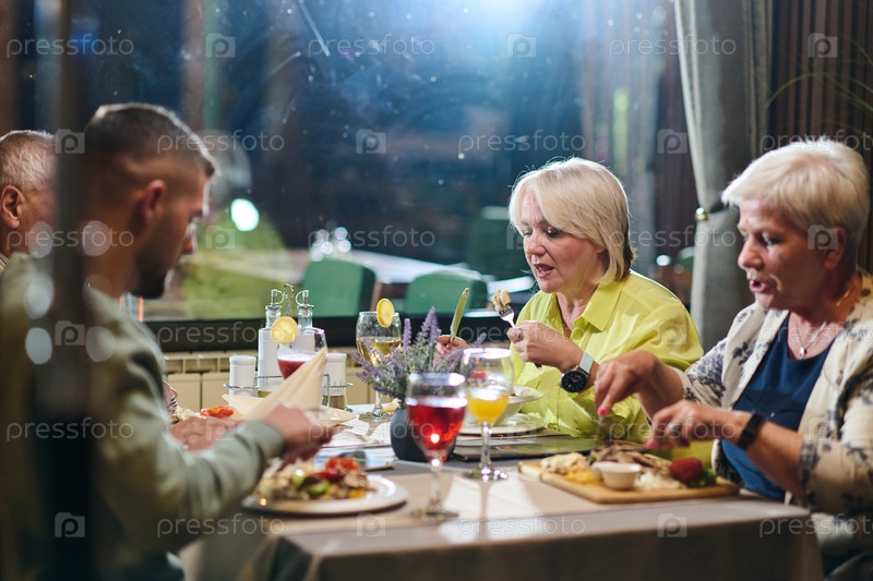 Группа друзей семьи, в которую входят молодой внук и пожилые люди, наслаждаются восхитительным ужином в современном ресторане, демонстрируя концепцию здорового старения через межпоколенческие связи и радостный обеденный опыт