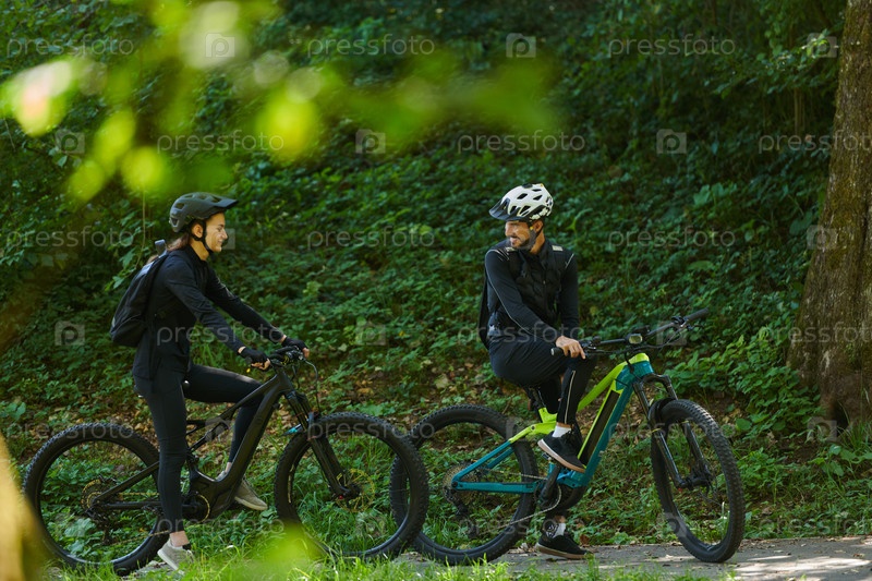 Счастливая пара, одетая в профессиональную велосипедную экипировку, наслаждается романтической велопрогулкой по парку, окруженному современными природными достопримечательностями, излучая любовь и счастье