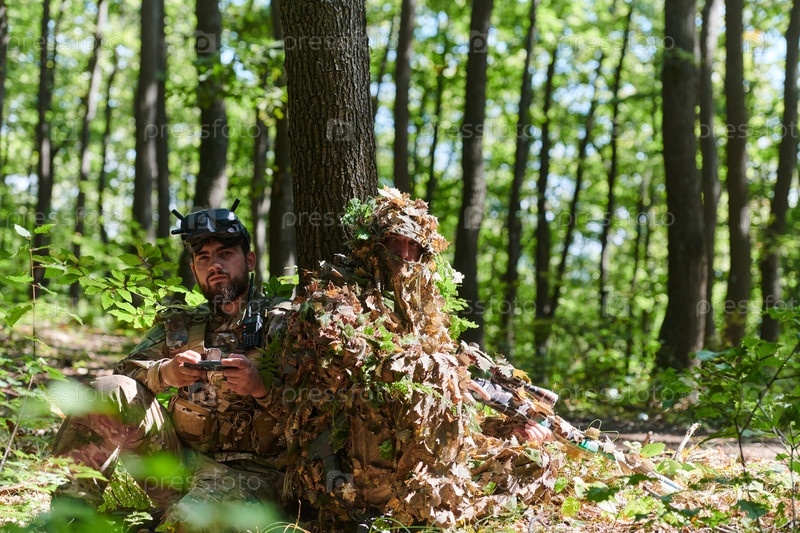Опытный снайпер и солдат, управляющий дроном с очками виртуальной реальности, разрабатывают стратегию и наблюдают за военными действиями, скрываясь в лесу