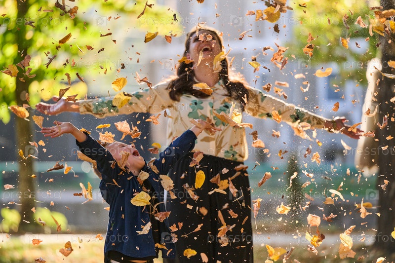 Современная женщина с радостью играет со своим сыном в парке, подбрасывая листья в прекрасный осенний день, запечатлевая суть семейной жизни и теплоту отношений матери и сына в разгар осени