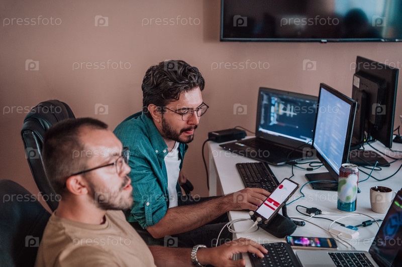Программисты, погруженные в тесное сотрудничество, усердно трудятся вместе над решением сложных проблем и разработкой инновационных мобильных приложений с безупречной функциональностью