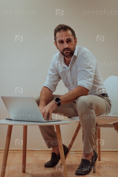 Уверенный в себе бизнесмен сидит и с решительным выражением лица пользуется ноутбуком, а бежевый фон усиливает профессиональную атмосферу, демонстрируя его производительность и опыт