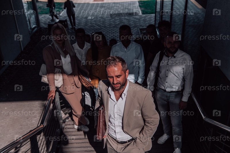 Группа бизнесменов и коллег из разных слоев общества прогуливается по своему рабочему месту, демонстрируя сотрудничество и командную работу в компании