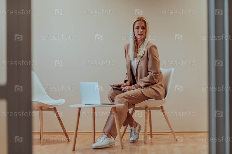 Профессиональная бизнес-леди сидит на стуле на спокойном бежевом фоне, усердно работая на своем ноутбуке, демонстрируя преданность делу и сосредоточенность на достижении успеха