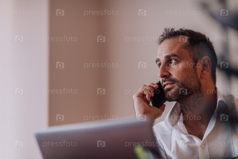 Бизнесмен разговаривает по смартфону, сидя в офисе, демонстрируя свое профессиональное поведение и активное общение