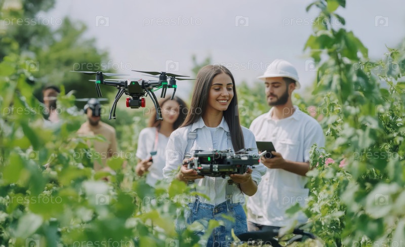 Разнообразная группа фермеров изучает технологию интеллектуального земледелия в поле осенью. Сгенерированное изображение