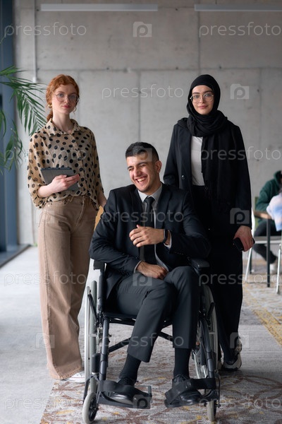 Разнообразная бизнес-команда уверенно позирует, включая улыбающегося директора, сидящего в инвалидном кресле, в окружении двух коллег-женщин, одна из которых в хиджабе, а другая держит планшет, в современной офисной обстановке