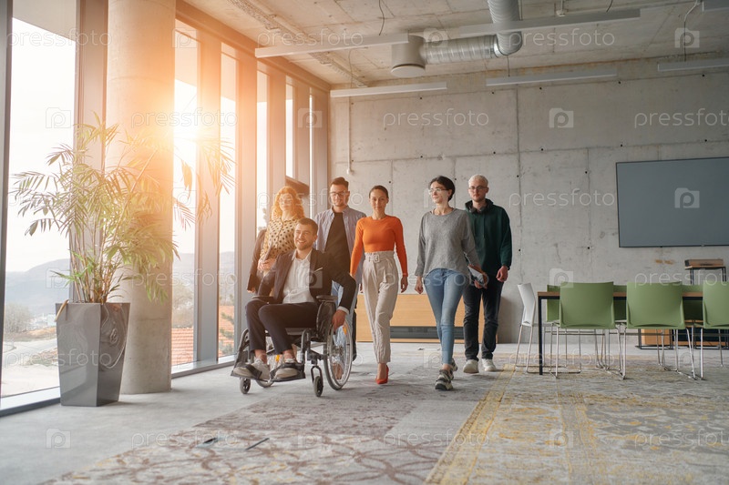 Команда профессионалов бизнеса перемещается по просторному современному офису, помогая своему руководителю, бизнесмену в инвалидной коляске, сотрудничая и перемещаясь по рабочему месту