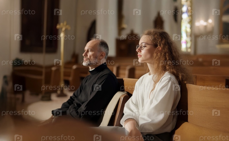 Священник внимательно слушает женщину, делящуюся своей верой в церкви