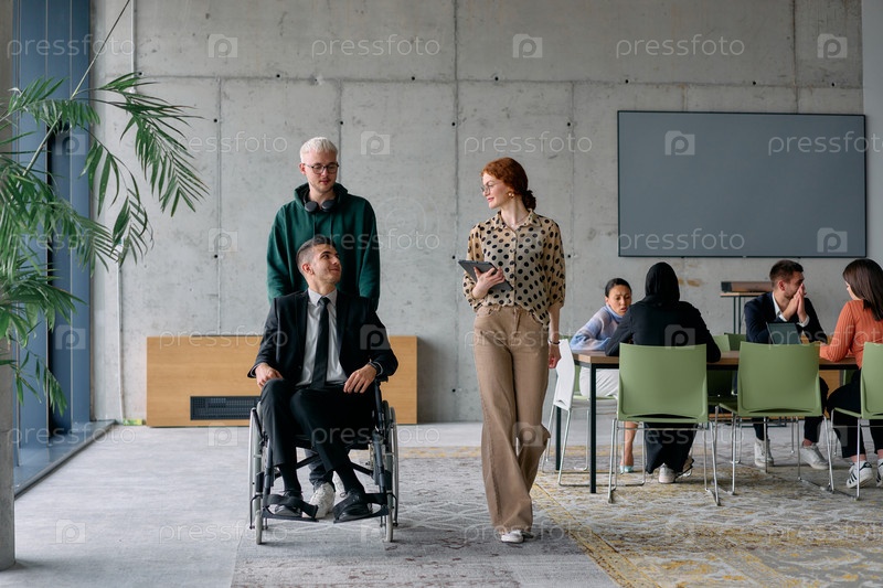 Разнообразная команда коллег по бизнесу, включая директора в инвалидной коляске, участвует в совместной дискуссии, перемещаясь по современному офисному пространству