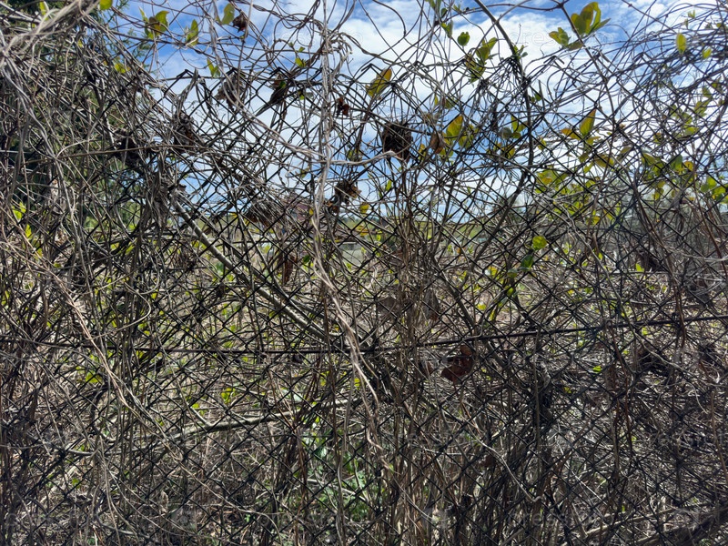Сетчатый забор, увитый вьющимися растениями