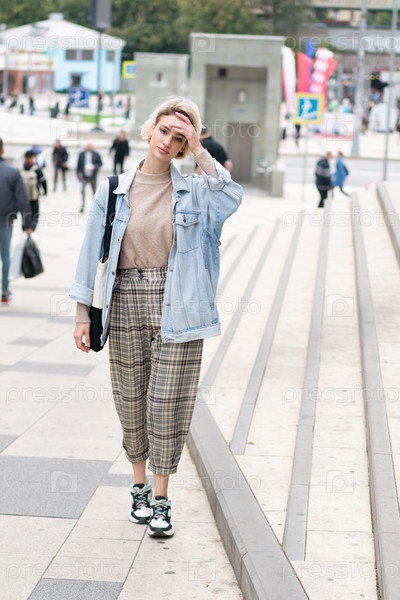 Молодая красивая женщина позирует в синей джинсовой куртке на улице