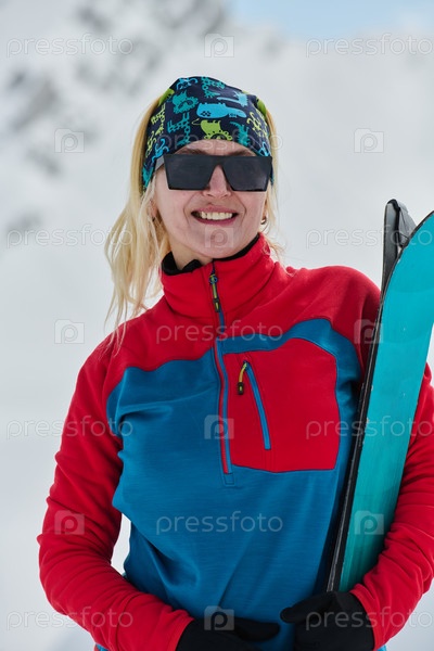 Профессиональная лыжница радуется после успешного восхождения на заснеженные вершины Альп