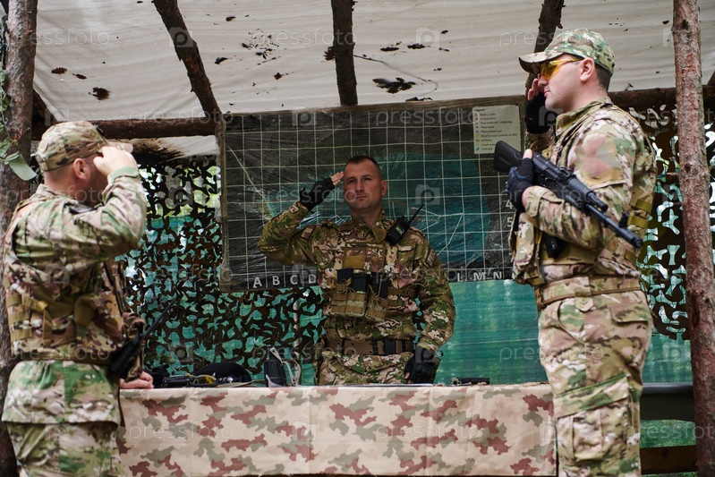 Высококвалифицированное военное подразделение разрабатывает стратегию и организует тактическую миссию, изучая военную карту во время инструктажа