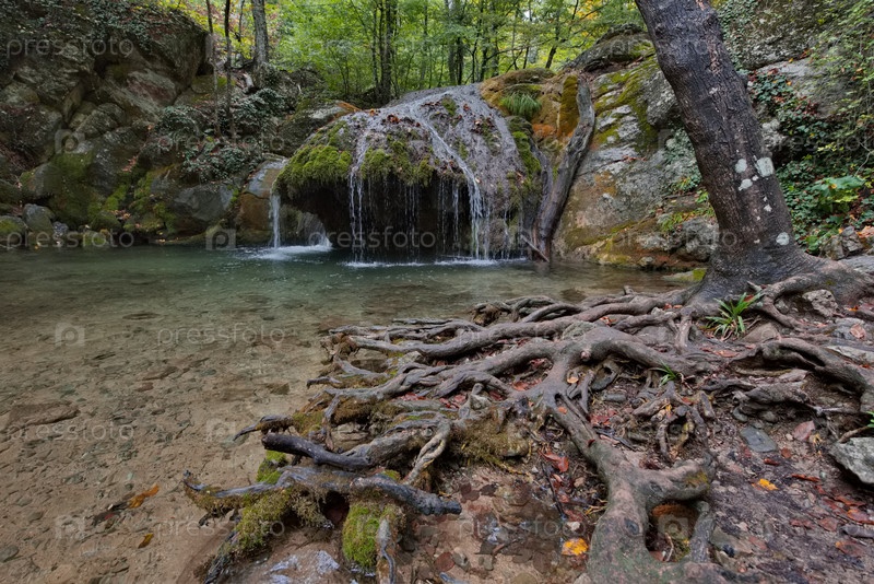 Россия, Республика Крым. Вид на водопад реки Улу-Узень в тени скалистых зарослей горного ущелья Хапхальского гидрологического заповедника в окружении корней деревьев
