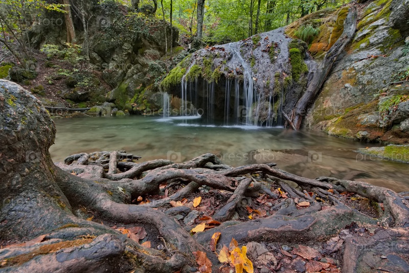 Россия, Республика Крым. Вид на водопад реки Улу-Узень в тени скалистых зарослей горного ущелья Хапхальского гидрологического заповедника в окружении корней деревьев