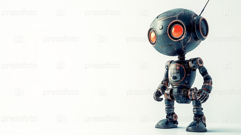 Винтажный ретро-робот в стиле стимпанк с ржавыми частями стоит на белом фоне