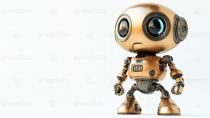 Винтажный ретро-робот в стиле стимпанк с ржавыми частями стоит на белом фоне