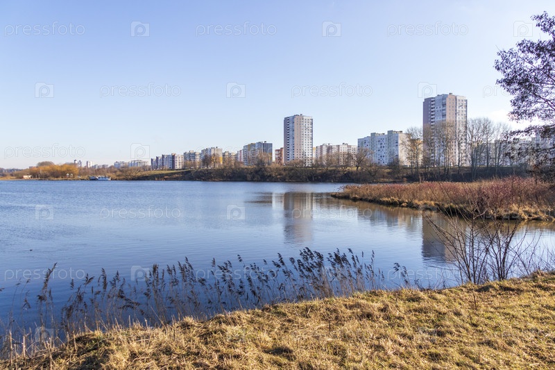 Снимок современного города на берегу реки. Городской