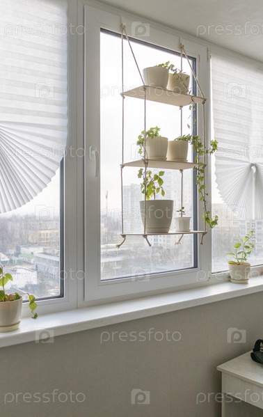 Декоративная полка с цветочными горшками на ней у окна. Интерьер