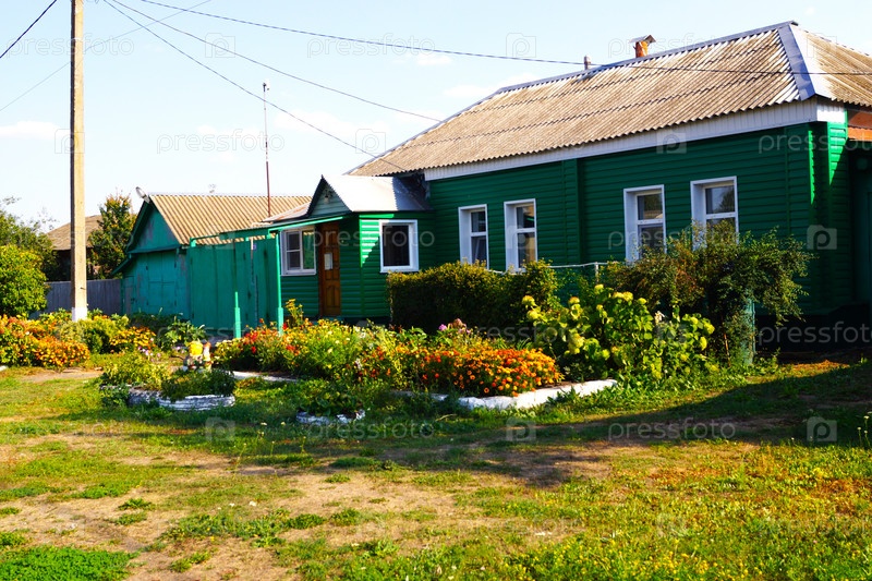 Зеленый дом в деревне с цветочными клумбами