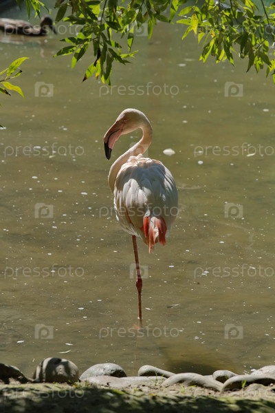 Россия. Новосибирский зоопарк имени Ростислава Шило. Розовый фламинго в открытом вольере богатого планктоном озера зоопарка