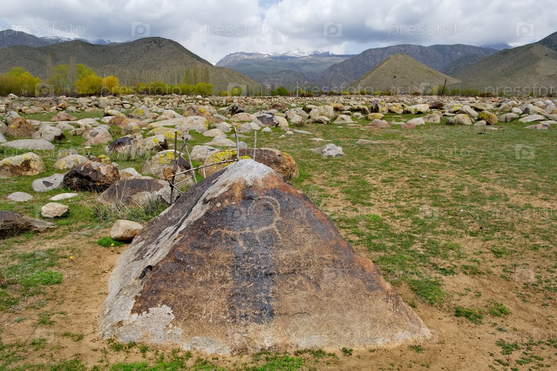 Кыргызстан, Чолпон-Ата. 23 апреля 2024 года. Древние петроглифы в музее петроглифов под открытым небом на северном берегу озера Иссык-Куль. Их возраст составляет 2000-2500 лет