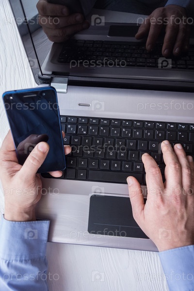 Мужчина за ноутбуком со смартфоном