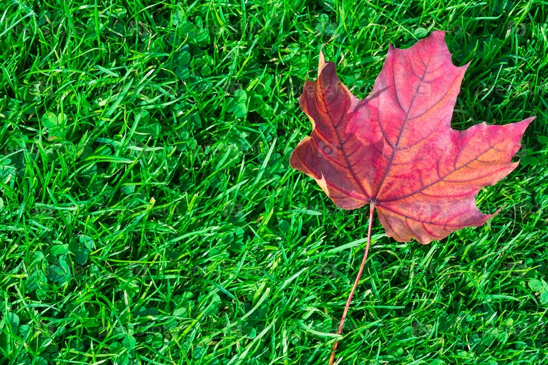 Осенний кленовый лист на зеленой траве