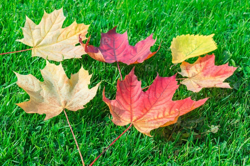 Осенний кленовый лист на зеленой траве