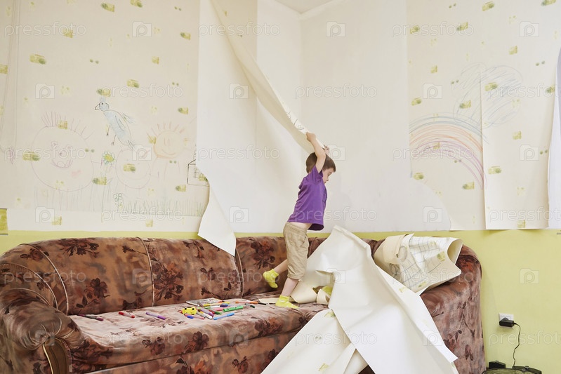 Мальчик срывает крашеные обои со стены. Понятие пандемии и изоляции