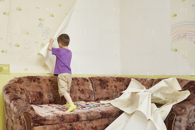 Ребенок разрывает обои в комнате во время карантина и изоляции из-за пандемии коронавируса COVID-19
