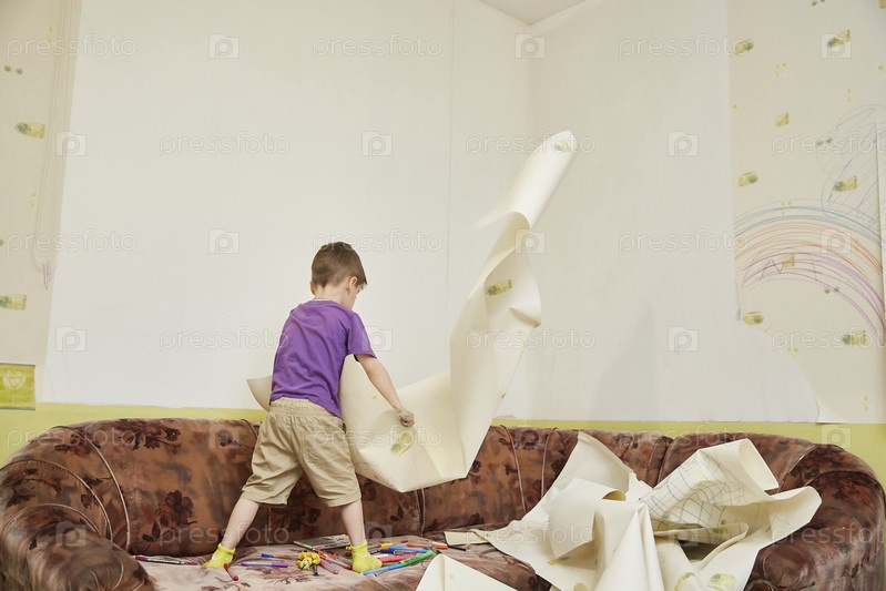 Мальчик срывает испачканные обои на стене в комнате. Психические проблемы и психическое здоровье во время изоляции