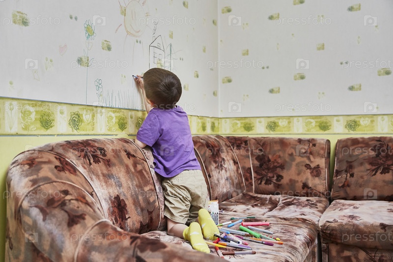 Ребенок рисует на обоях, стоя на диване в гостиной. Концепция самоизоляции во время коронавируса