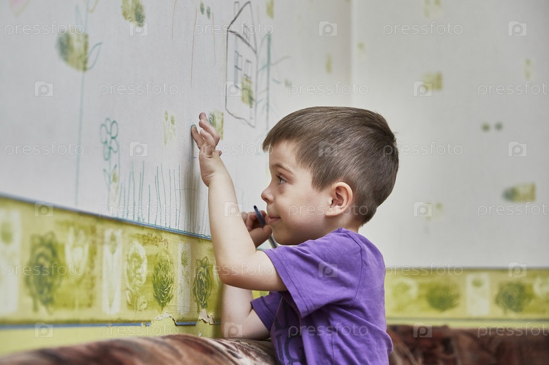 Мальчик рисует на стенах. Ребенок развлекается и пачкает стену